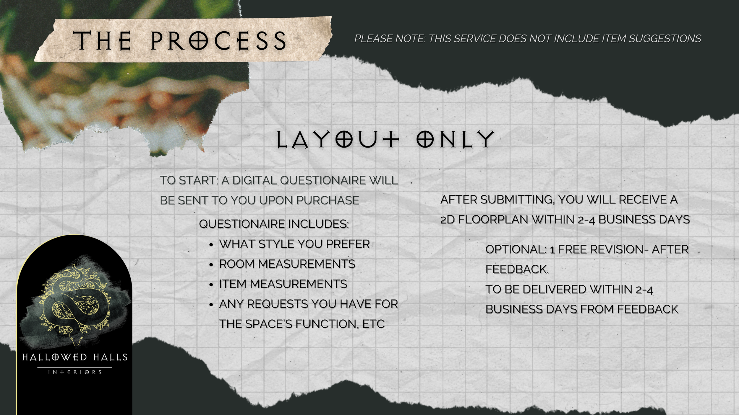 This is the service for you. With this *Layout Only* option, I am here to help you create the most functional and aesthetic layout of your current pieces. This listing does not include furniture suggestions!